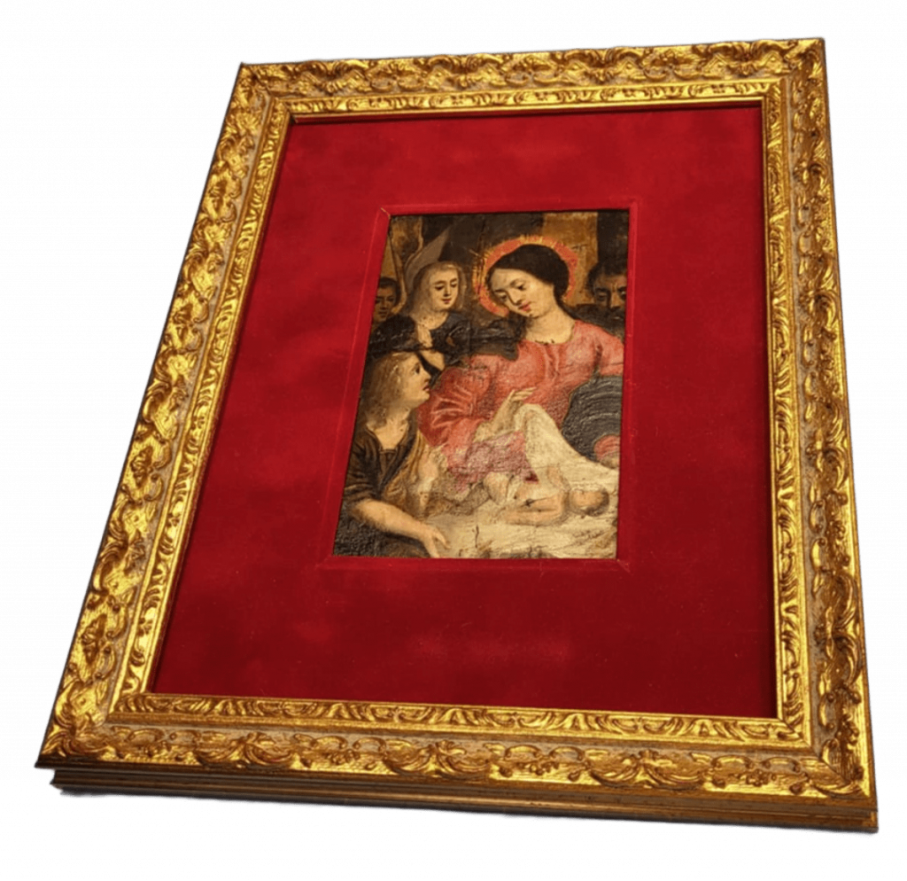 Cette peinture du XVIIIᵉ siècle porte les marques du temps : une surface irrégulière, une patine naturelle, quelques fragilités liées à son âge. Ces traces font partie de son identité et doivent être respectées.