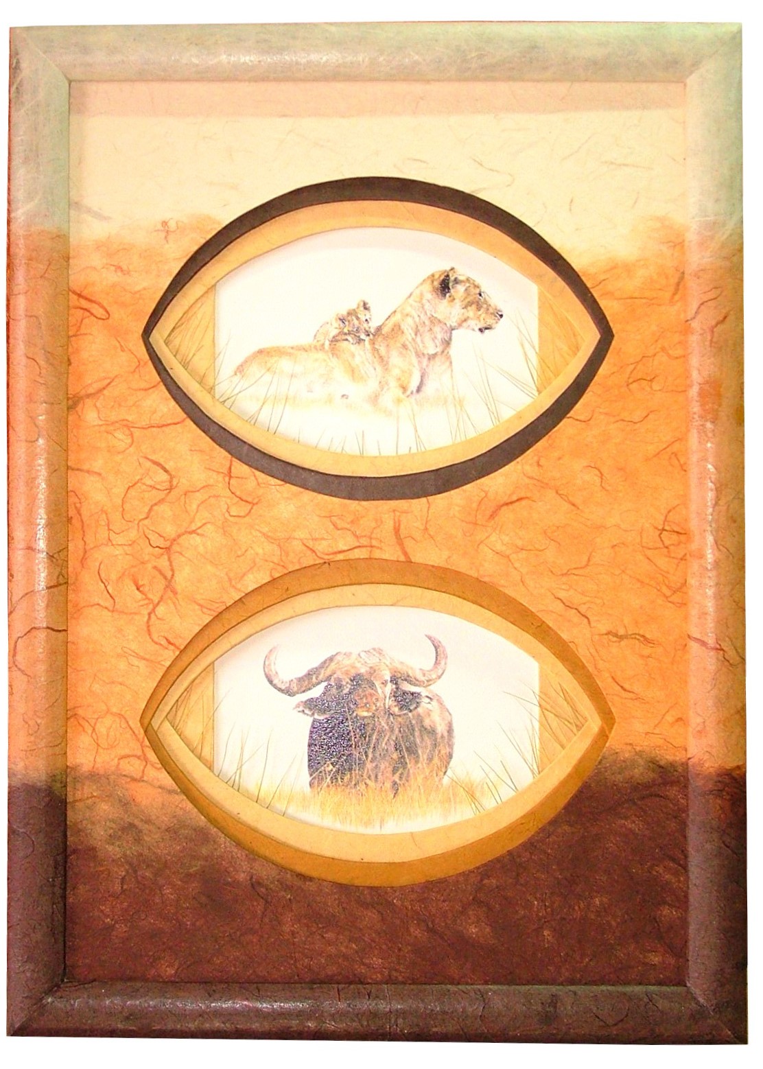 Ce tableau présente les dessins d’une lionne et d’un buffle. Ces derniers sont mis en valeur à travers 2 yeux qui peuvent représenter la vision proie/prédateur de chacun des 2 animaux. Les différentes matières de papier ainsi que les couleurs rappellent le sol présent dans la savane africaine.