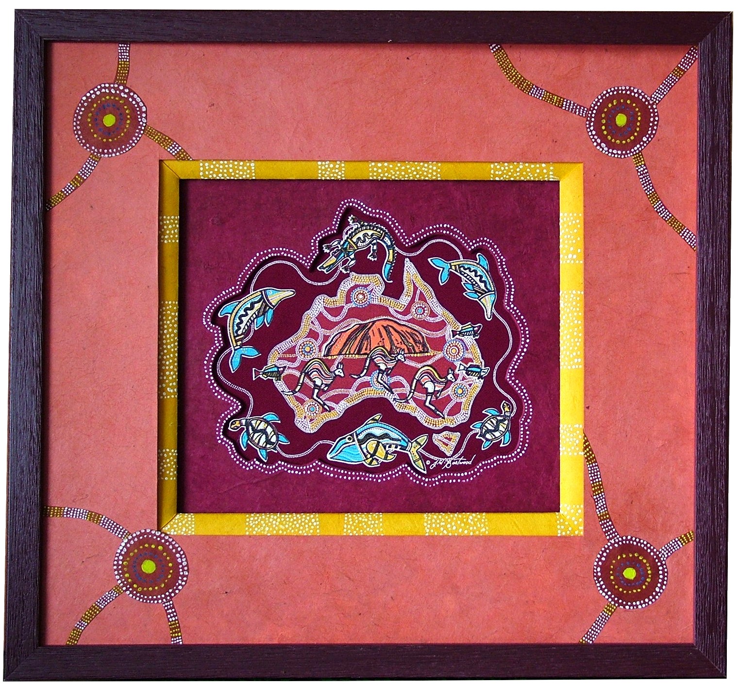 Ce tissu est typique de l’art aborigène australien avec ses couleurs et ses motifs. Des kangourous, des tortues et des dauphins sont représentés. Ce sont des animaux totems dans la culture aborigène. On voit également le rocher rouge emblématique d’Australie, Ayers Rock ou Uluru.