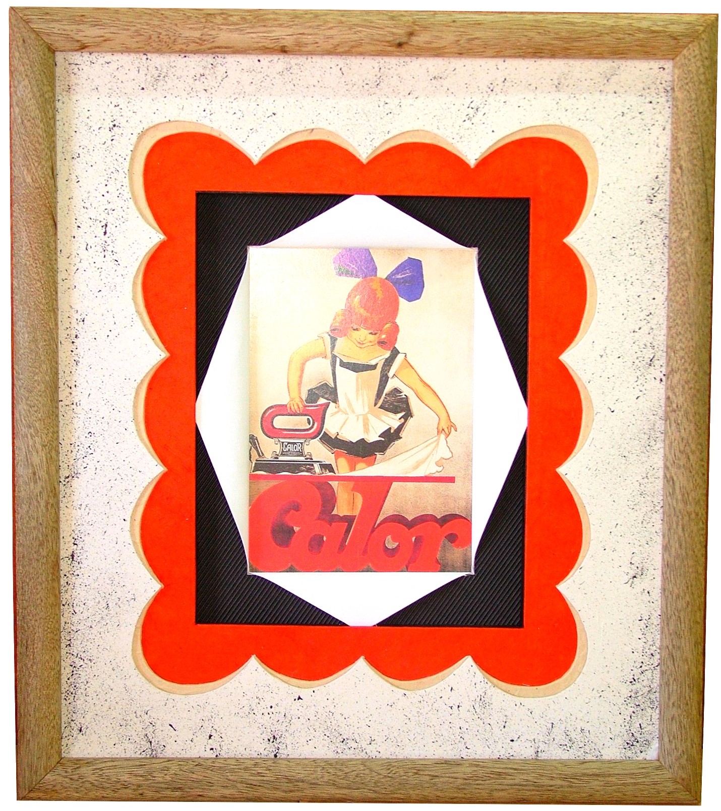 Voilà une carte publicitaire vintage pour la marque Calor ! Celle-ci aurait été produite dans les années 50. On y voit une jeune femme en tablier, légèrement vêtue, utilisant le fer à repasser de la marque Calor. Les couleurs sont vives et le rouge de la marque est rappelé par l’encadrement.