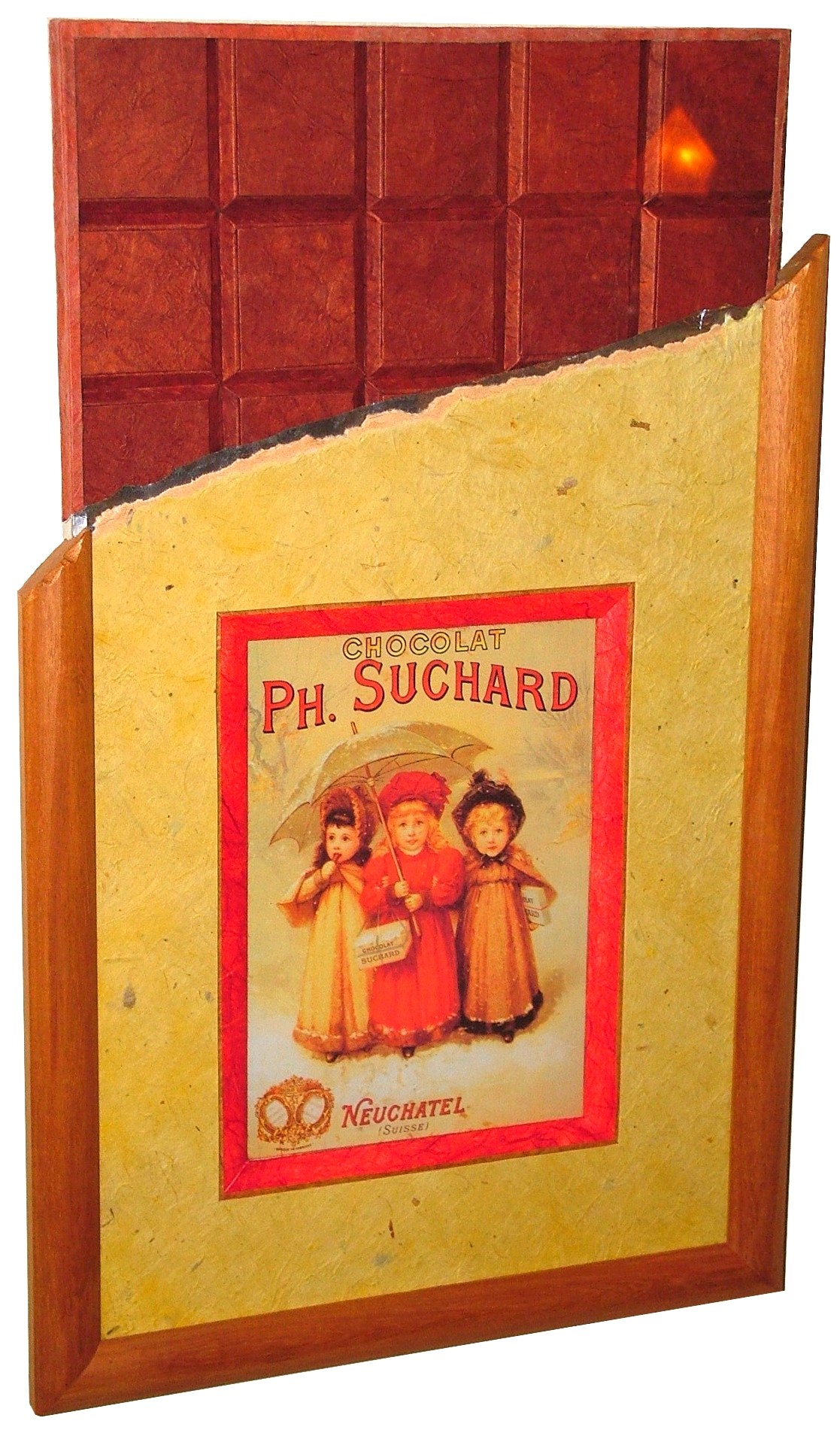 Carte publicitaire pour le chocolat Suchard, encadrée dans une tablette en chocolat pour vous mettre l’eau à la bouche !