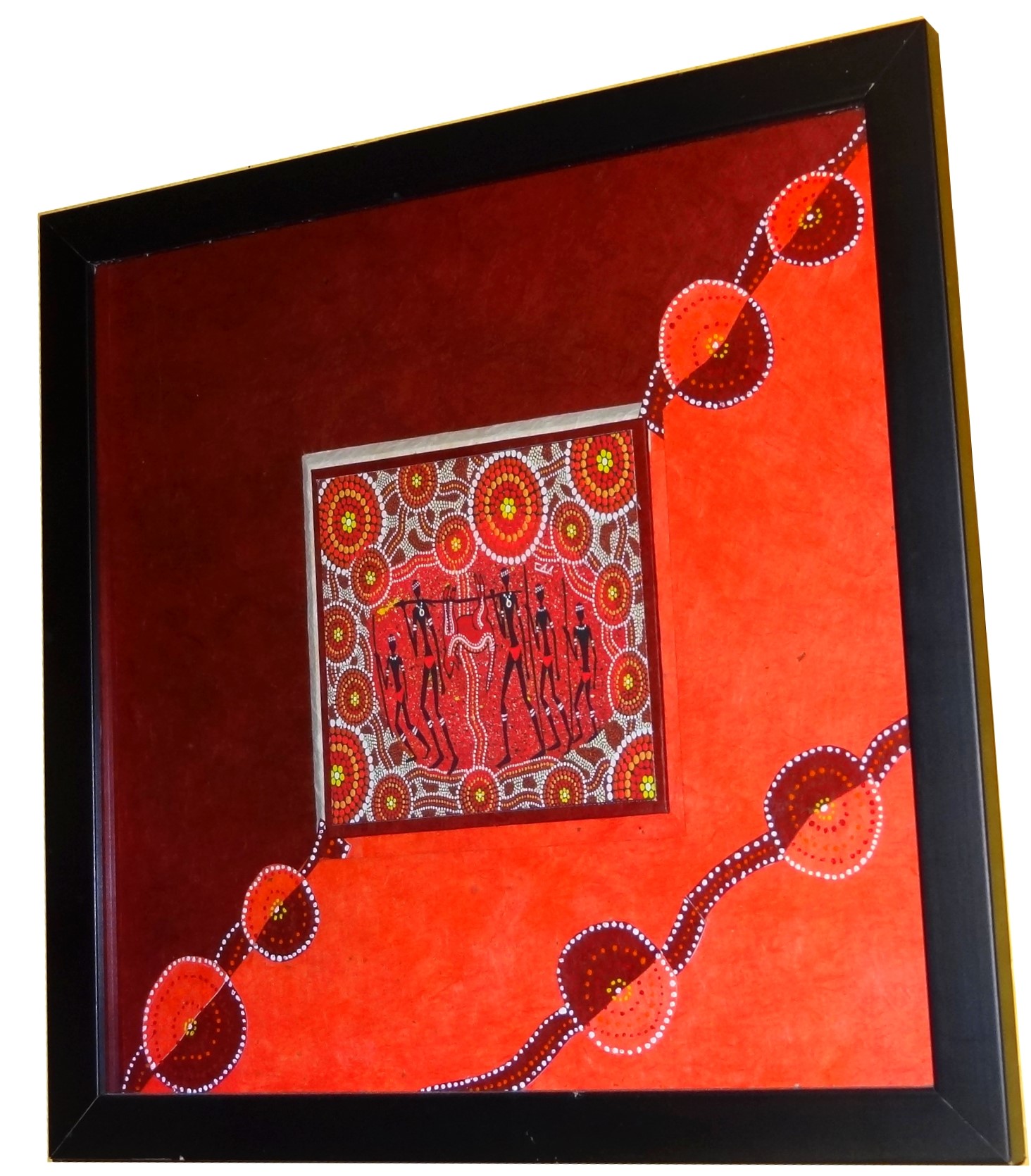Ce tissu est typique de l’art aborigène australien avec son fond rouge intense et ses motifs circulaires. Au centre, des figures humaines sont représentées de manière simplifiée. Elles semblent être en cercle ou en groupe, suggérant peut-être une cérémonie ou une réunion.