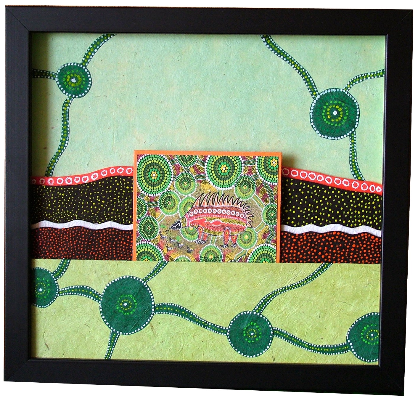 Ce tissu est typique de l’art aborigène australien avec ses couleurs et ses motifs circulaires. Au centre,  des figures humaines sont représentées de manière simplifiée. Au centre, on peut y voir un animal ressemblant à un porc-épic. Les cercles verts reliés qui bordent l’image pourraient représenter des sites sacrés ou des points d’eau interconnectés, un thème commun dans l’art aborigène qui montre l’importance de la connexion entre les lieux sacrés et les ressources naturelles.