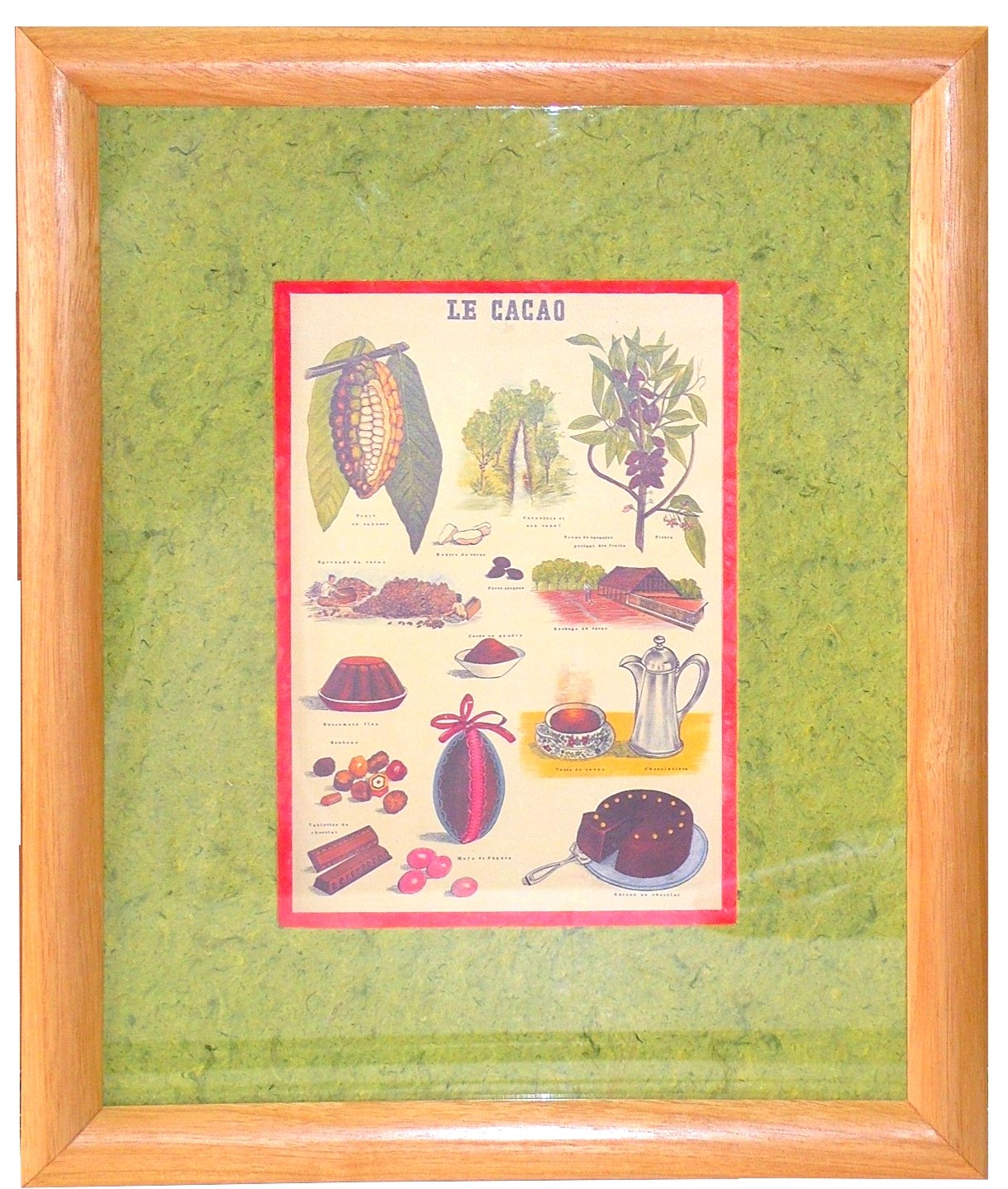 La carte est encadrée par biseau anglais (à 45°) dans un cadre en bois rappelant l’origine naturelle du cacao, également soulignée par le cache vert. Ce cadre sera idéal pour agrémenter votre cuisine.