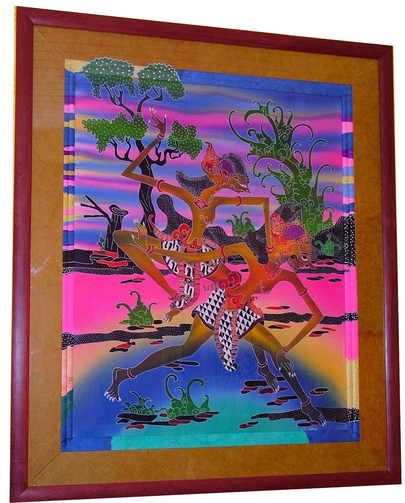 L’œuvre est un batik indonésien, il s’agit d’une technique textile traditionnelle d’Indonésie. Elle consiste à appliquer de la cire sur le tissu pour créer des motifs avant de le teindre. Ce dernier représente une scène artistique richement colorée, typique de l’art indonésien, avec des personnages dans des poses dynamiques et élégantes.