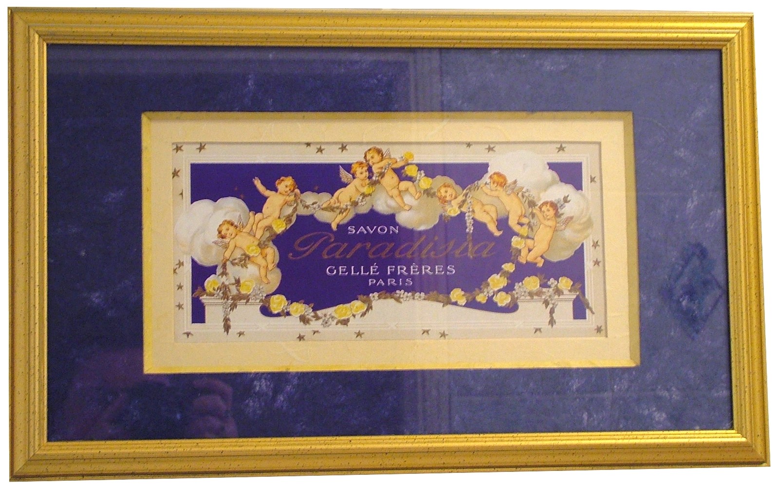 Jolie carte postale évoquant le savon Paradisia produit par la maison Gellé Frères, encadrée par biseau anglais et avec sous carte.
